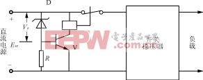 在该电路中,当输入直流电源的电压高于稳压二极管的击穿电压值时,稳压管击穿,有电流流过电阻R,使晶体管V导通,继电器动作,常闭接点断开,切断输入。其中稳压管的稳压值Vz=ESrmax-UBE。输入电源的极性保护电路可以跟输入过电压保护结合在一起,构成极性保护鉴别与过电压保护电路。