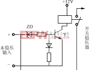 当未稳压输入的电压值正常时,稳压管ZD击穿,晶体管V导通,继电器动作,触点吸合,开关稳压器加电。当输入低于所允许的最低电压值时,稳压管ZD不通,V截止,触点跳开,开关稳压器不能工作。