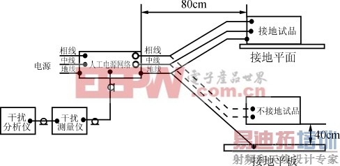 人工电源网络的外表面和试品边界之间的最近距离应小于0.8m。网络的参考接地端应该用尽量粗短的导线接到接地平板上。电源电缆和信号电缆走线与接地平板间的相关情况应与实际使用情况等效,并应十分小心地布置电缆,以免造成假响应效应。