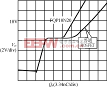 图7为FQP10N20与普通MOSFET关断损耗波形比较。波形面积与器件关断期间的能耗成正比,由于QFET的波形面积小于普通MOSFET,故有较低的关断损耗。图8示出了关断期间栅-源极之间电压Vgs的波形对比。由于QFET有较小的栅极电荷,所以Vgs的关断下降时间比普通MOSFET短。