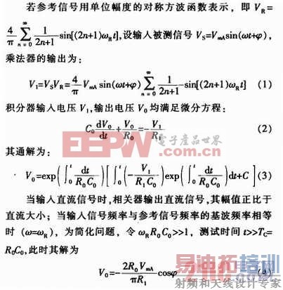 由此可知,相关器输出为直流电压,其值正比于输入信号的基波振幅,并与参考信号之间的相位差的余弦成正比。[p]