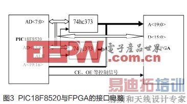 无线通讯模块采用成都众山科技ZSD2110 GPRS DTU。ZSD2110是一款使用GPRS进行无线数据传输的终端设备,支持透明数据传输和用户自由控制传输模式,本系统中采用透明数据传输模式,不用关系复杂的网络协议,通过全透明串行口,就可进行无线数据收发,可大大简化单片机软件程序的设计。GPS授时模块采用Garmin的GPS15XL,它是12通道的GPS接收机,精密授时类型精度可达±50纳秒(典型值);具有串行端口,输出为RS232,输入可为RS232或者具有RS232极性的TTL电平,波特率从300~38400可选,默认为4800。可输出NMEA0183 2.0/3.0的ASCII码语句/Garmin二进制格式信息。非常适合应用于车辆导航、海事导航、电力系统校时等。由于DTU和GPS模块都是通过串行口与单片机连接,接口比较简单,需特别说明的是单片机与FPGA之间的数据通信接口电路。单片机PIC18F8520需通过其EMI接口从FPGA获取故障波形数据和时标信息。由于PIC18F8520的EMI接口中16bit数据线和低16bit的地址线共用,与FPGA之间不能直接相连,接口连接如图3所示。