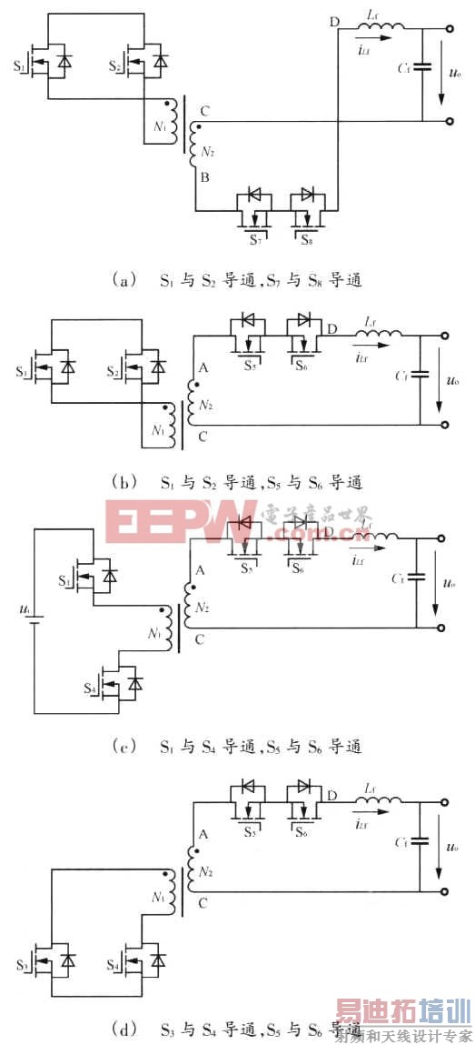 当输入电压Ui降低或负载变大时,导致输出电压Uo.降低,闭环反馈控制使得移相角θ减小、共同导通时间Tcom增大,从而使得输出电压增大。因此.调节移相角θ可实现输出电压的稳定。