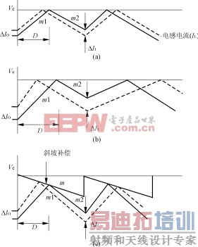 进一步可引入斜率为-m的斜坡信号,如图2(c)所示。这个斜坡电压既可加至电流波形上,也可以从误差电压中减去。有下列方程式成立: