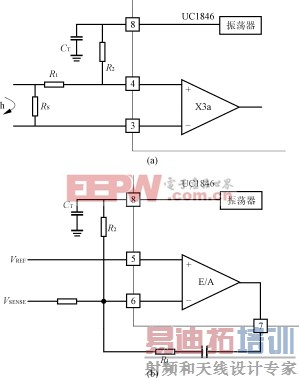 UC1846是一种采用斜坡补偿的电流型集成控制芯片,它具有恒频PWM电流型控制所需的控制电路和相关电路。图5(a)和图5(b)表示采用UC1846实施斜坡补偿的两种电路原理图。在第4脚的电流检测信号和斜坡补偿信号直接相加很容易实现,但这又在电流检测电路中引入了误差。另一种方法就是把这个斜坡补偿加至误差放大器的反相输入端,采用这种方法的前提条件是: