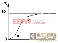 软磁材料在交变磁场中,刚开始O点随着电流nI变大, B开始缓慢变大,当到a点时,B急剧变大,当到b点,B增加变缓,当到c点H再变大时,B几乎不再变大,我们说材料被磁化到了饱和。达到饱和之后,无论H怎样增大,材料的磁感应强度也不再增大。此时的磁感应强度 称为饱和磁感应强度,用Bs来表示。B-H关系画成曲线,就是材料B-H磁化曲线。饱和磁感应强度是磁性材料的一个重要指标。
