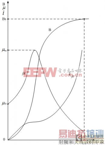 由图2-51中可以看出,导磁率最大的地方并不是磁感应强度或磁场强度最小或最大的地方,而是位于磁感应强度或磁场强度某个中间值的地方。当导磁率达到最大值之后,导磁率将随着磁感应强度或磁场强度增大,而迅速下降;当导磁率下降到将要接近0的时候,我们就认为开关变压器铁芯已经开始饱和,如图中Bs和Hs。此时,开关变压器初级线圈的电感量将下降到0,励磁电流将变成无限大。