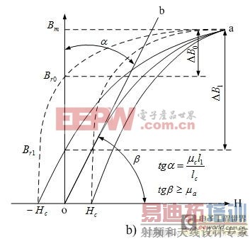 图2-52-b) 中,虚线是没留有气隙开关变压器铁芯的磁化曲线,实线是留有气隙开关变压器铁芯的磁化曲线;曲线b是留有气隙开关变压器铁芯的等效磁化曲线,其等效导磁率,即曲线的斜率为tgβ ; μa是留有气隙开关变压器铁芯的平均导磁率; μc是没留有气隙时开关变压器铁芯的导磁率。
