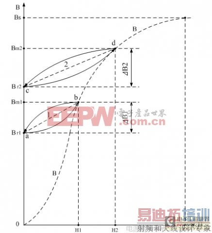 如果磁场强度进一步增大,由0增加到H2,则磁化曲线将沿着曲线cd和dc进行,对应产生的磁通增量⊿B2 = Bm2-Br2。