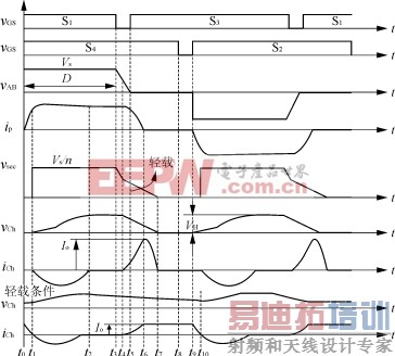 在半个工作周期内,变换器有8种开关模态。因为,电流环能够根据负载的变化而作相应的调整,所以,这些开关模态在负载较轻的情况下变化很小。