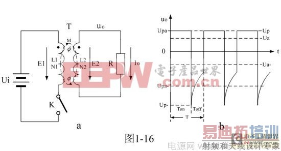 图1-16-a是单激式变压器开关电源的最简单工作原理图。图1-16-a中,Ui是开关电源的输入电压,T是开关变压器,K是控制开关,R是负载电阻。
