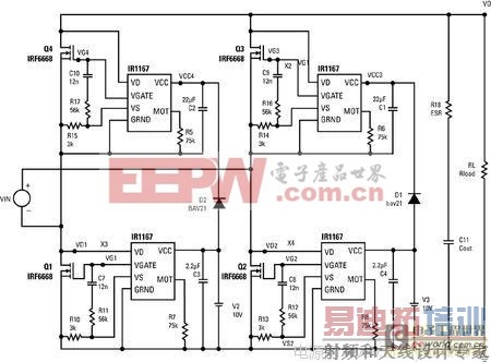图2:IR两款同步整流控制芯片IRF1166和IRF1167为200V以下电压提供一个简单的分离式解决方案