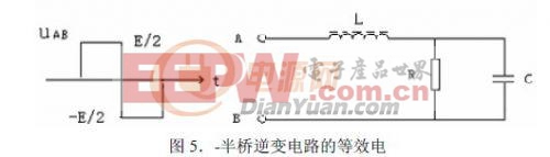 C.两个三极管VT1、VT2 的电流与电容C4的续流电流共同构成一个连续波形,提供给灯管,使之正常发光。如果把C4的电流当成三极管的电流的一部分,无源半桥C7、C8上的电压看作直流电压,分别为VDC/2(或E/2),有源半桥VT1、VT2分别看作是短路或截止,其中点对地电压为理想的矩形方波,幅度为E/2,那么半桥逆变电路的等效电路可简化为图5的形式。图中,A、B分别为两个半桥中点,uAB是它们之间的电压,R即是灯管的等效电阻RLA,等于管压/管流之比,这里为简化计,以R表示之;L为扼流电感,即图1中的L2;C为启动电容(有的文章把C7作为谐振电路的一部分来分析,显然是错误的),即图1中的C6。