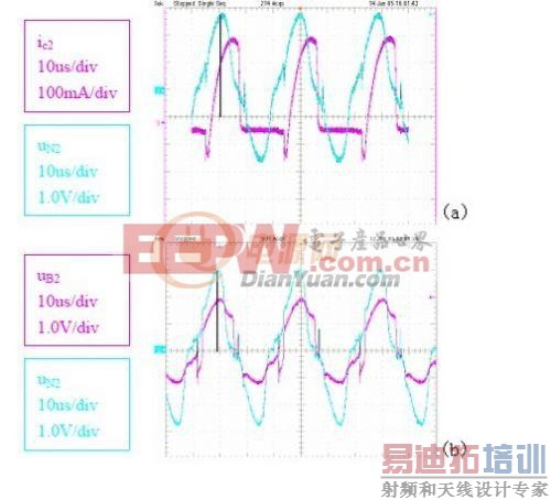 由于iB2变为负值,以及iB2、ic2 、iE2之间满足iE2═iB2+ic2的关系,发射极电流iE2会在其峰值附近出现一个向下的凹陷,凹陷的开始点同基极负电流的开始点是一致的,在观察发射极电阻上的电压(即发射极电流iE2)波形时,很容易看到这种情况。