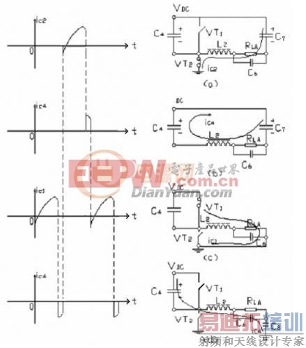 由于VT1截止,电容C4将被充电,充电电流ic4接续了电流ic1。电流ic4流通路径如图4d,其方向是由下而上的,与先前图4b中C4的放电电流方向相反,因而是一个负脉冲。该脉冲的前沿幅度等于ic1向下的跳变值,而其后沿幅度则等于VT2开始导通时ic2的向下的跳变值。因为一旦VT2导通,vCE2≈0,C4电压立即上升到VDC,结束充电电流,并形成陡峭的后沿。以后VT2导通,便恢复到3.1的情况。