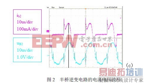 2.1 半桥逆变电路的转换过程是这样的:在VT1截止、VT2导通时,先是利用反向基流-ib2使VT2从饱和退出、进入放大状态、集电极电流减小,利用外电路的再生反馈、在极其短暫的时间内,使VT2由导通变为截止、VT1由截止变为导通,并在大约半个周期的时间内,维持这一状态。然后,又依靠反向基流-ib1使VT1从饱和导通状态退出、进入放大状态、再一次利用外电路的再生反馈、在极其短暫的时间内使之由导通变为截止,并在大约半个周期内维持VT1截止、VT2导通状态。如此周而复始,往复循环,完成一连串的振荡波形。