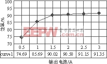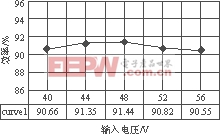 图9给出了变换器效率曲线。图9(a)为输入电压一定,负载电流不同时的变换效率曲线,可以看出,满载时效率最高,为91.35%。图9(b)为负载电流一定,输入电压不同时的变换效率曲线,可以看到,效率随输入电压变化而变化的范围很小。