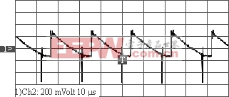 图5所示为高频变压器原、副边波形,由图5可见工作周期是20μs,原副边是以同名端作为示波器的正端的。图6所示为输出滤波电感的波形。