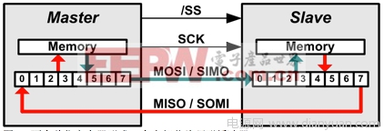 数据传输通常会包含一次数据交换。当主节点向从节点发送数据时,从节点也会向主节点发送数据。为此,主节点的内部移位寄存器和从节点被设置成环形(请参见图 2)。