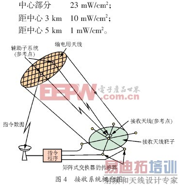 接收系统的概念图如图4 所示。若在地面设置一个参考定向点RB(Reference Beam),由此与卫星输电进行通信联系,并控制卫星的发射方向和强度。将微波发射点(卫星上)的电力密度合成后,定向点的电力密度的宽度为1 km(用高斯表示中心部分的高斯量为23 kW/m2),故地面上定向点RB 周围的电力密度可相应为: