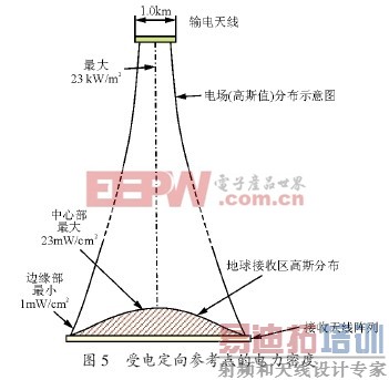 输电(发射)定向参考点RB 和受电(接收)RB的电力密度分布图如图5 所示。在宇宙上空的发射点虽然密度大,但只对飞机(引起燃料箱放电)有所影响,而地面的电力密度却很低,还不致超过美国规定的微波泄露功率允许值10 mW/cm2。当然,发射和接收二者的配合十分重要,若空中的阵列定向点设置稍有不当,则会影响输电效率,使地面上的天线无法捕捉到全部电力,因而会使某些地面电场强度过高而产生危险。信号传输时经图4 的磁控管传感器系统检测后,才由指令系统(Command Link)对发射定向点进行控制。