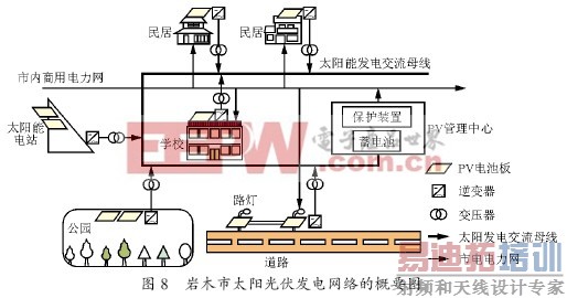 根据员怨怨苑年日本交通省的新能源规划已将岩木市作为试点,具体是在学校、公园、道路、公共场所等引入太阳能发电装置约300 kW,并形成新能源管理网络。该设计已在1997—圆园园源年期间实现,系统的概要图如图8 所示。图中,每一设施均应用太阳能电池板供电,系统之间用直流300 V母线连接,并经逆变器变换为交流200 V。交流电经升压变压器升至6 600 V,以构成交流供电网络。交流网络一方面可与市电电网联系进行能量的双向流动;另一方面将信号送至PV 管理中心,进行电力的集中管理、分配、信息储存,以便系统安全、连续运行。当市电停电时,可由预先储备的300 A·h蓄电池组供电,大约可以维持一天的基本用电。因此,该系统同时具备了城市防灾功能。