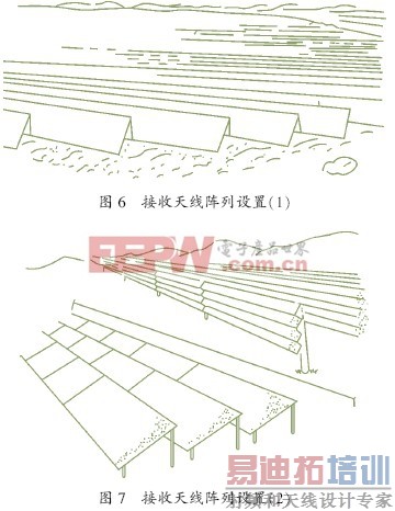接收天线阵列布置的设想图如图6 和图7所示。从远处看接收天线阵列设置好像是一组一组的屋顶,但平面部分做成网状的帘棚,可以完全阻断微波。