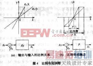 在专用PID调节器中,比例增益的大小常常是通过“比例带”来进行调节的。比例带就是按比例放大的区域,用P表示(等于是Kp的倒数),如图4所示。P越小,相当于KP越大。但在几乎所有变频器内置的PID调节功能中,都是直接预置KP的。