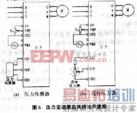 ② 远传压力表其基本结构是在压力表的指针轴上附加一个能够带动电位器滑动触点的装置。因此,从电路器件的角度看,实际上是一个电阻值随压力而变的电位器。使用时,需另行设计电路将压力的大小转换成电压或电流信号。通常,变频器内可以提供转换电路所需的电压,如成都希望森兰变频器制造有限公司BTl2S变频器中,可提供24V直流电压,其接线方法如图6(b)所示。