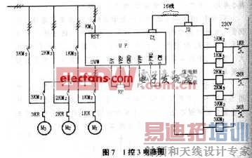 很多变频器都带有专用于由1台变频器控制多台水泵的附件,称为扩展板。以森兰BTl2S系列变频器为例,其控制电路如图7所示。接触器KM1用于接通变频器的电源;IKM2、 2KM2、3KM2分别用于将电动机M1、M2、M3接至变频器的输出端;IKM3、2KM3、3KM3分别用于将电动机M1,M2、 M3接至工频电源。除KM1外,其余6个接触器都由继电器扩展板进行控制。
