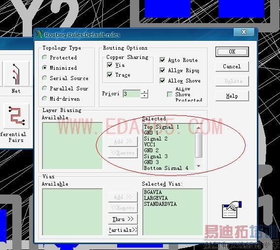 这个中间信号层(第6层),我在“SetupLayer Definition”中设的是RT(routing+ No plane),方向是Any。