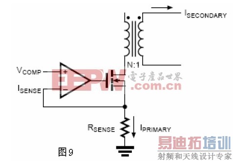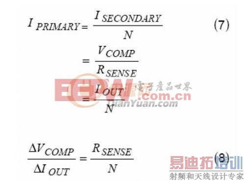 从ISECONDARY以后(见图9),副边电流或者说输出电流与主边电流成比例,把等式(4)重新排列表示出副边电流与VCOMP之间的关系。