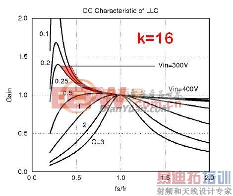 从图上我们可以看到,当负载增大时,Q值也增大,Q值曲线左移,Q值曲线与Mx相交点的频率是降低的。因此我们可以看到当负载增加的时候,LLC的工作频率是减小的。从物理意义上来讲,当负载阻抗Rac减小的时候,Lr与Cr构成的串联谐振回路上的阻抗也要减小,以维持Rac上得到的分压不变。只有通过降低频率才能使Lr和Cr构成的串联阻抗减小。因此,当负载加重时,LLC的开关频率是减小的;当负载减轻的时候,LLC的开关频率是增大的。