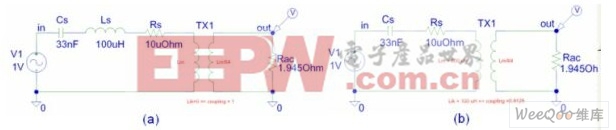图5:分立(a)和集成(b)谐振回路解决方案的仿真原理图。