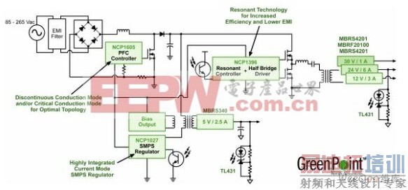 图6:采用NCP1396A的安森美半导体GreenPoint 220瓦液晶电视电源参考设计。