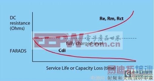 图3显示了各种参数在单个电池寿命期间内的渐进曲线。同一特性在放电或容量下降期间也得到了证实。等效电路的全部阻抗因素都遵循近似的曲线;在早期失效或容量下降阶段,没有大幅改变。如果将阻抗用作单个电池工作状态的主要指示,它将不会给出任何有意义的指示,除非容量下降幅度超过25-30%。因为行业标准是更换性能下降至规定性能80%以下的电池,显而易见,必须尽早识别可能的失效。