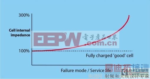 图1:电池内部阻抗并非是临近失效的有效指示。指数曲线意味着,早期失效难以察觉,但是后期性能劣化非常快。