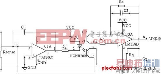 图4 为电流采样电路。Rsense 用一小阻值精密电阻作为采样电阻, 通过将电阻两端电压使用差分放大器输送到SPCE061 的A/ D 端进行采样。为使采样精确, 避免电源线与地线干扰, 使用线性光耦HCNR200 进行隔离。