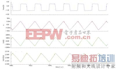 图2和图3分别为滞环控制降压转换器在不同RC下的波形。其中,VIN=8V、VREF=2.5V、L=10μH、C=47μF和ROUT=2.5Ω。对于图2和图3的电路,输出电容器的等效串联电阻RC分别为50mΩ和5mΩ。图中从上而下的曲线分别表示VSW、s、iC和VOUT的波形。图2的波形比较稳定,当S1开启时(当VSW处于高电压电平),s便下跌;相反,当S1关闭时,s便上升。在这情况下,ICMAX等于0.14A,而计算出RC的最小值为11.92mΩ。换句话说,一个50mΩ的RC便可满足要求,从而给出一个稳定的系统。可是对于图3而言,ICMAX等于0.9A,根据计算,得出RC的最小要求为76.59mΩ。很明显地,一个只有5mΩ的RC是不能符合要求的。从图3可看出,s不是在S1开和关后便立即增加或减小,而是稍微延迟了一点时间。结果,输出电压纹波将会明显地增加,从而产生出一个相对VSW的相移。这个现象对于滞环控制降压转换器来说很普遍,尤其当输出电容器的ESR过小时。