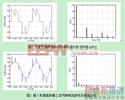 试验台中异步电机额定功率为132kW,直流侧电压约为510V,由式(9)可得等效电阻为Rd=2Ω。为了验证滤波器的有效性,对滤波器进行仿真研究。图4和图5分别给出了投入有源滤波器前后电网电流波形及频谱分析。通过比较可以看出,所设计的有源滤波器能够有效的抑制变频器网侧谐波,使得电网谐波电流大大降低。