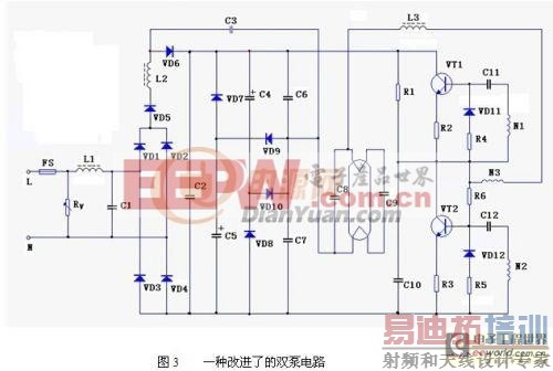 对逐流电路的改进是采用双泵电路,用图2(b)电路来代替图2(a)的电路,它在前者的基础上增加C3、C4,将高频信号进行反馈,减少了电容上直流电压的起伏,进一步减少了电流死区时间和灯电流波峰系数,各项指标均有所提高,但仍然无法满足国标GB/T17263-2002对各次谐波含量限值的要求。如在图2(b)电路的基础上再采取一些改进和补救措施,便可以达到标准的要求,图3就是这样一种改进了的双泵电路,目前在节能灯及电子镇流器中有不少产品在应用它,并且通过了3C认证。