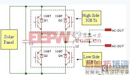 太阳能逆变器是一种功率电子电路,能把太阳能电池板的直流电压转换为交流电压来驱动家用电器、照明及电机工具等交流负载。如图1所示,太阳能逆变器的典型架构一般采用四个开关的全桥拓扑。
