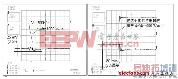 开关设备每次开关时产生的高dv/dt值将在主电缆和传感器的电子电路之间产生电容电流。大多数模拟线性放大器对这种寄生电流很灵敏。因此,dv/dt噪声将被叠加在输出信号上。根据变动电压的幅度和斜坡,初始尖峰和后来的振荡有时会非常高,以致它们会激活传感器的电流保护电路,进而使逆电器暂停运转。LEM的经验在HX系列设计阶段帮助保证了对关键噪声的完美免疫力,而又不会损害带宽,因此HX的性能要超过其它类似的传感器(图2和图3)。