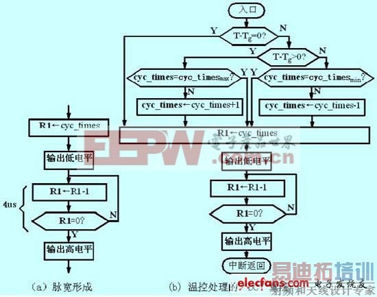 t _ on 的确定,可以采用软件延时方法实现,假设控制功率开关元件通断的驱动电路采用负逻辑驱动,cyc _ times为延时程序控制循环次数的一个参数,则定时中断处理程序进行一次通断操作的流程如图4(a )所示,此时t _ n = 4 * cyc _ times 。