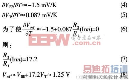 其中,VBE具有负温度系数,VT具有正温度系数,这样,通过调节n和R2/R1,就可以使Vref得到一个零温度系数的值。一般在室温下,有: