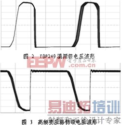 在实验时,当调压器输出交流电压为80V左右,经整流后直流电压可达100V,此时TOP249芯片刚刚启动(图2)。高频变压器出现自激振荡(图3)。在实际调试过程中,用倍压电路就能实现可靠引弧,在次级输出接上分压电阻可以测出波形(图4)。从波形可以看出TOP249处于正常工作状态,产生的波形比较理想。实验证明用TOP249实现的切割电源引弧电路工作稳定可靠。