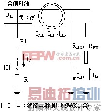 一般的直流绝缘监测方法是利用直流电源的控制母线的工作电压作为电源,通过检测正负母线的对地漏电流来测量母线的绝缘电阻。此方法的优点是检测电路简单、稳定性好;但是,由于现有直流测量方法的原因,无法准确测量直流电源合闸母线和各条电源馈出线的对地绝缘电阻,从而限制了其测量精度。