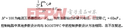 控制电路采用PFC专用芯片UC3854和适当外围电路。在这里我们选用UC3854的一部分功能,UC3854的乘法器输出电压作为电荷量的给定信号,积分电容上的电压Vt与乘法器输出电压经LM311比较得出翻转信号,将此信号送给UC3854的过流保护端子2脚,便得到对应的占空比输出,这里不使用其电流环上的误差放大器,UC3854的输出经反向后驱动积分电容上并联的开关管保证主开关管断开时,将积分电容上的电荷放掉,从而实现了对主开关管电流的准确积分,其中积分电容Ct的值需满足下式: