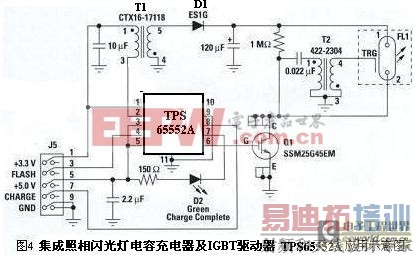5.21主要特点为:减少组件的高集成度解决方案;集成IGBT驱动器;高效化程序化后可提供0.95A至1.8A的峰值电流;输入电压为1.8V至12V;最优化控制回路以达到更快的充电时间;主侧感应所有的触发;封装模式为10 引脚MSOP及16引脚QFN封装。图4为TPS6552应用实例示意图。