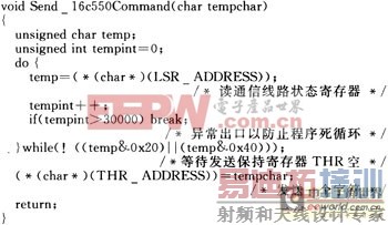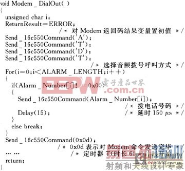 上述拨号程序模块中,函数Send 16c550Command()的功能是向Modem发送一个AT命令字符,函数体内容如下: